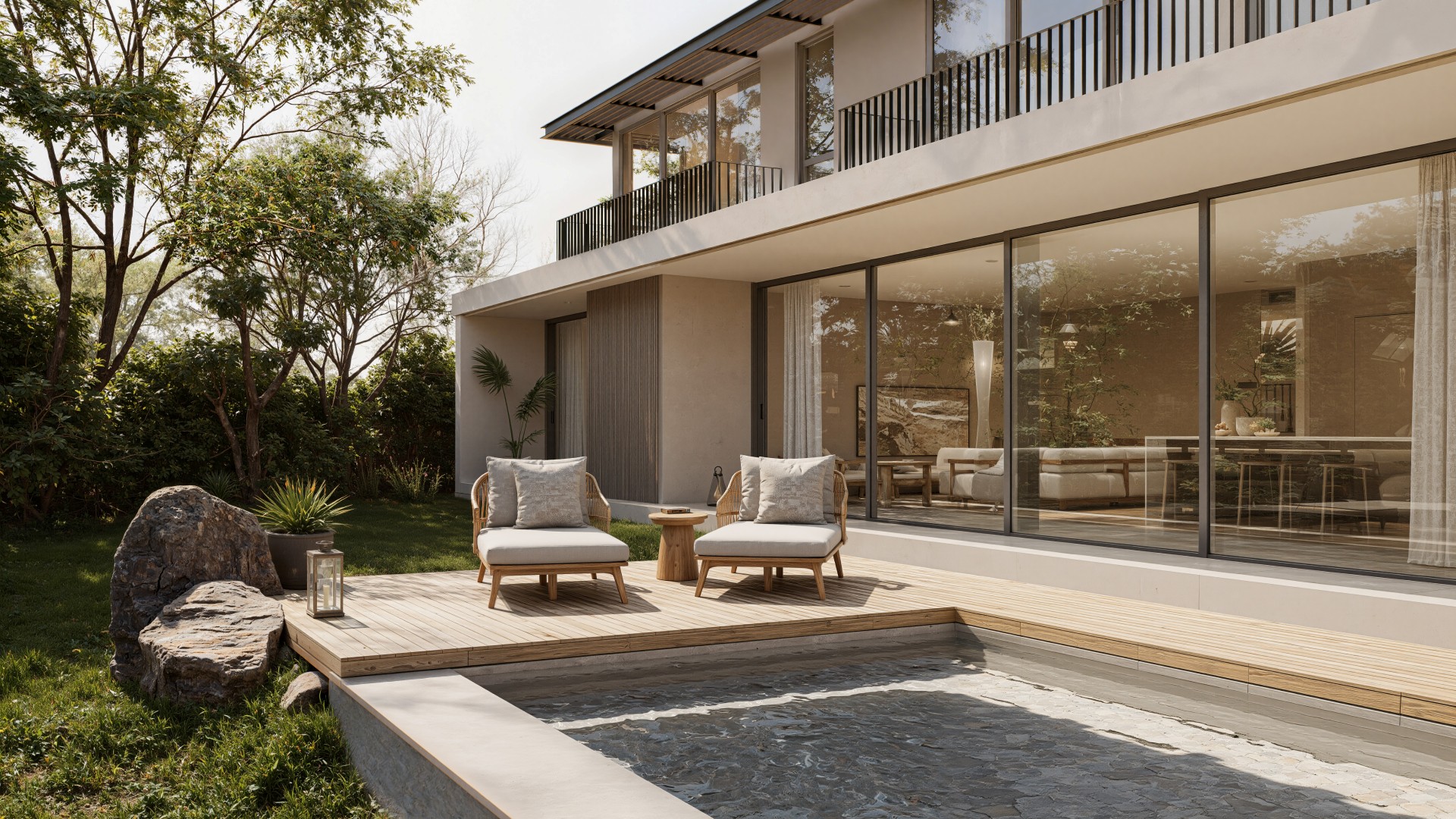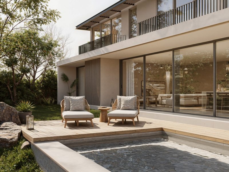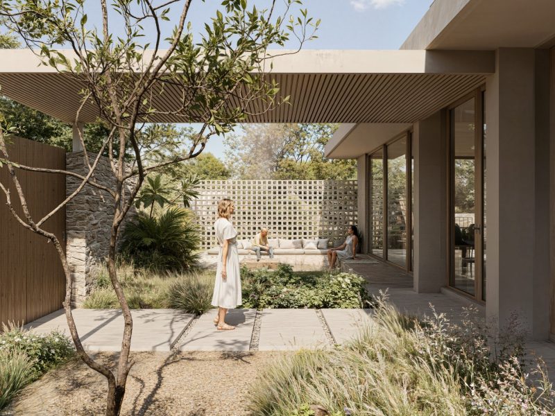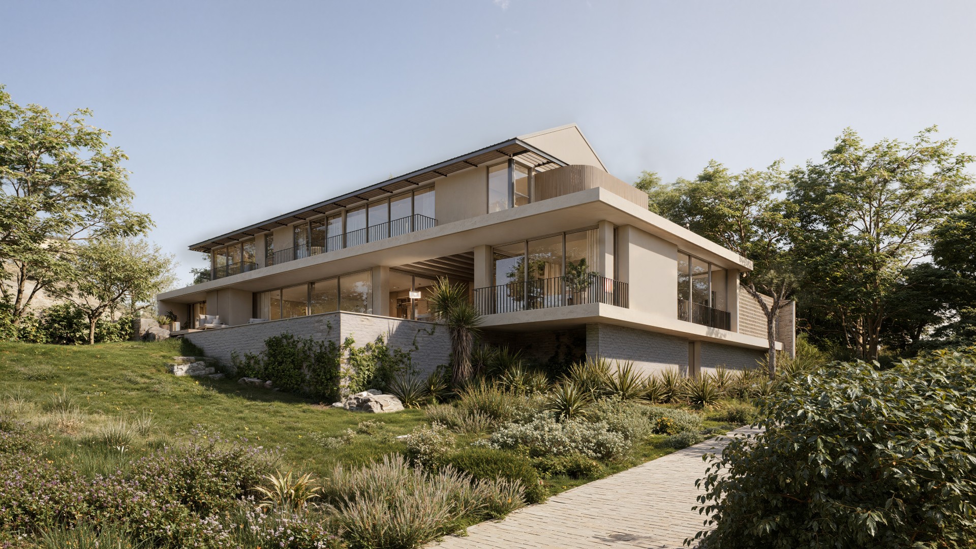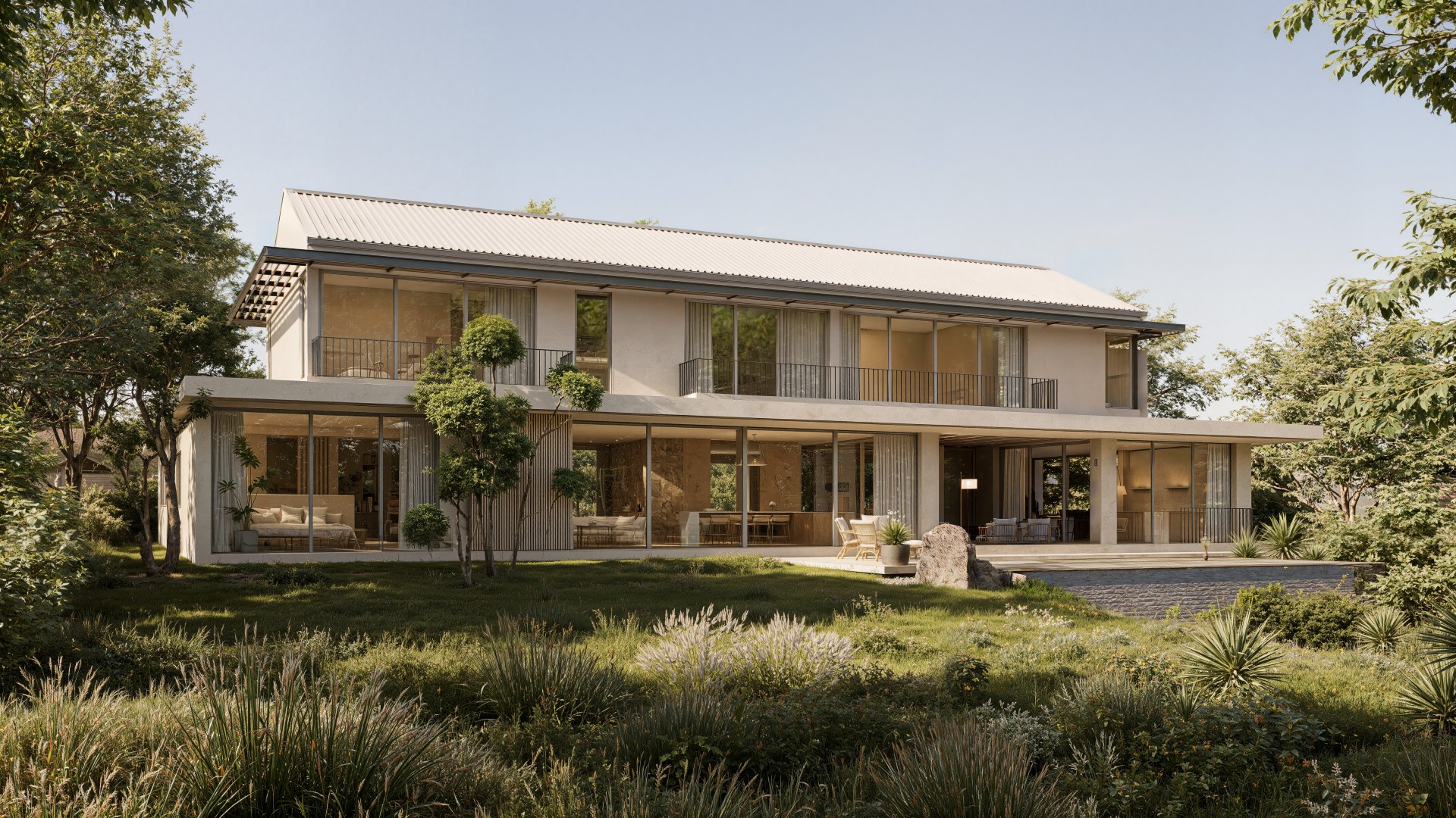 This contemporary residence in Seaton Estate, Salt Rock, is carefully composed to sit within its natural setting, balancing clean architectural lines with warm, tactile materials. The home is arranged around sheltered outdoor spaces, creating a seamless flow between interior living areas, landscaped courtyards, and garden terraces. Generous glazing, deep overhangs, and layered screens enhance light, privacy, and passive comfort throughout the house. The result is a refined yet relaxed family home that responds to the coastal estate lifestyle and its surrounding landscape.